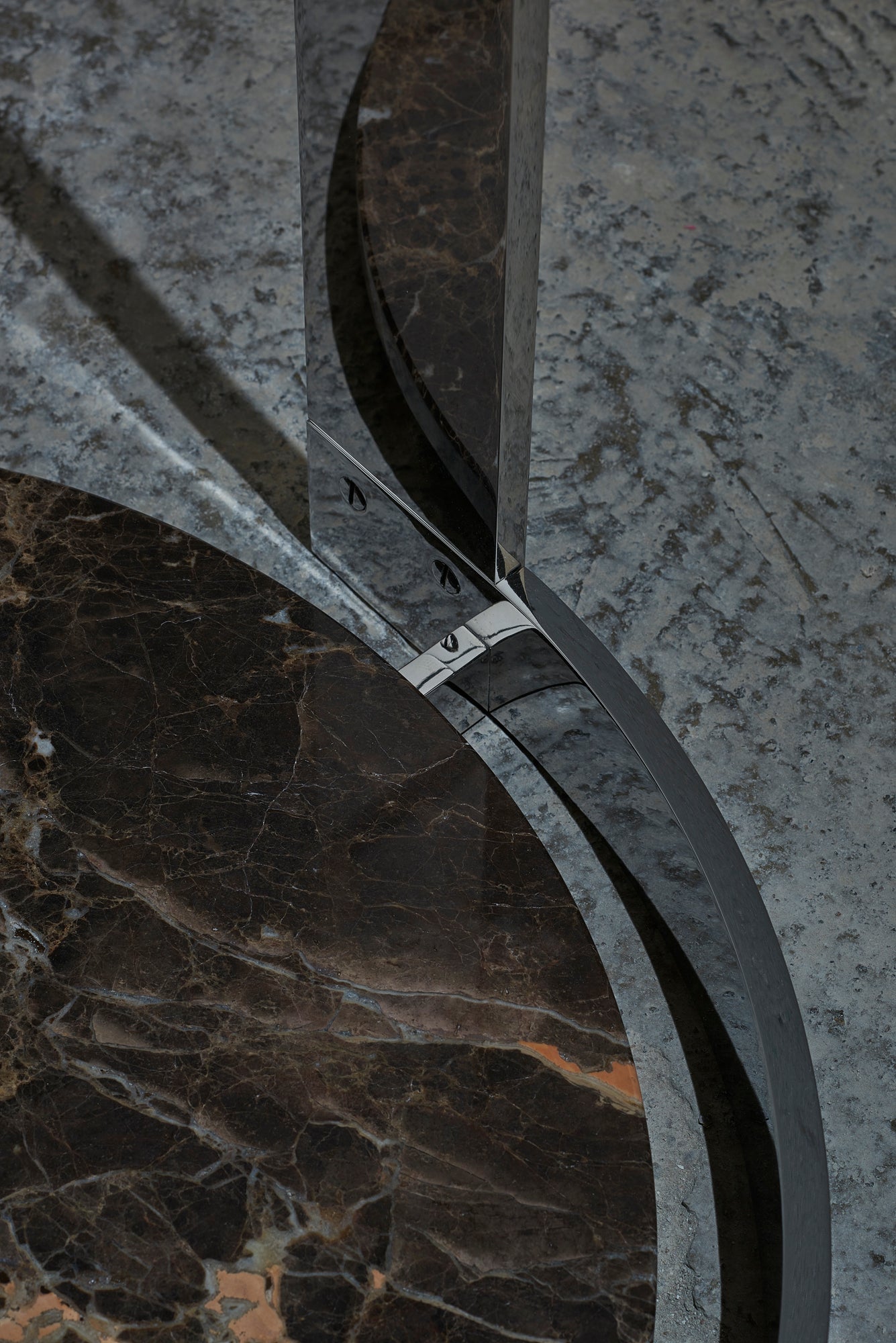 Formed from 12mm thick solid stainless steel strips, mirror polished and patinated, this choice piece enhances the garments hanging on it with a multitude of reflections.